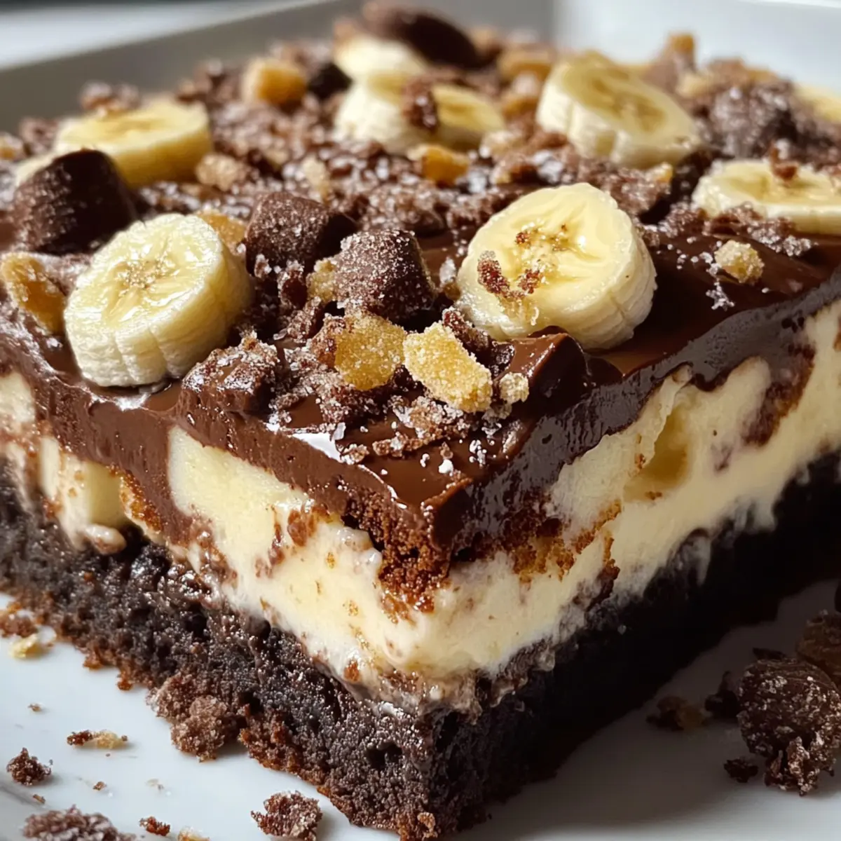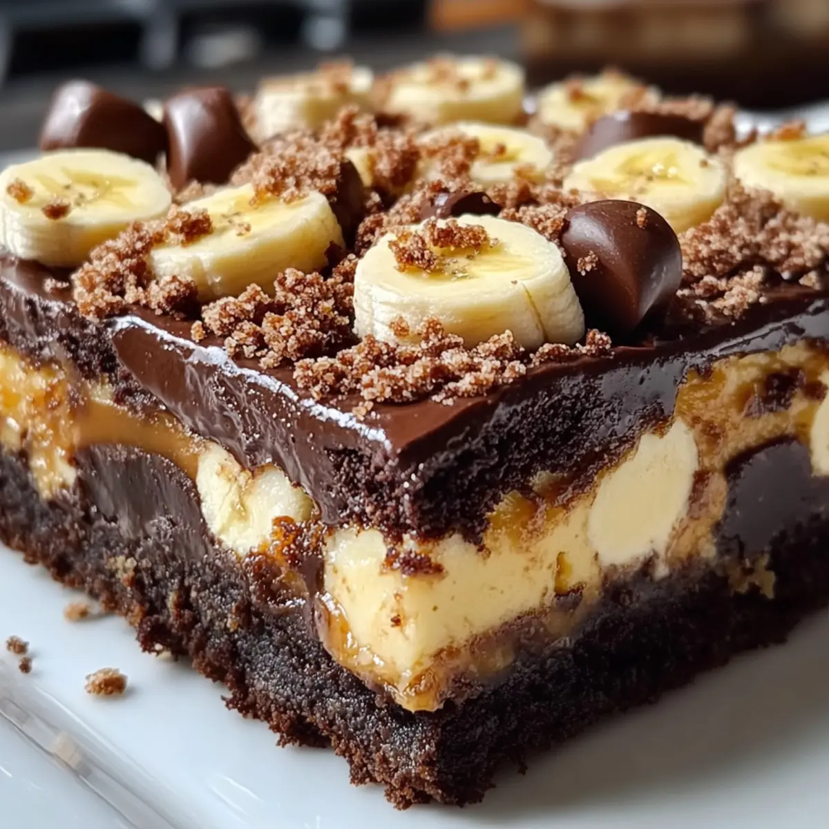Karamell Twist: Füge vor dem Backen einen Schuss Karamellsauce in den Teig ein. Die süße, zähflüssige Textur ergänzt das Fudgy und die cremige Bananenschicht perfekt.