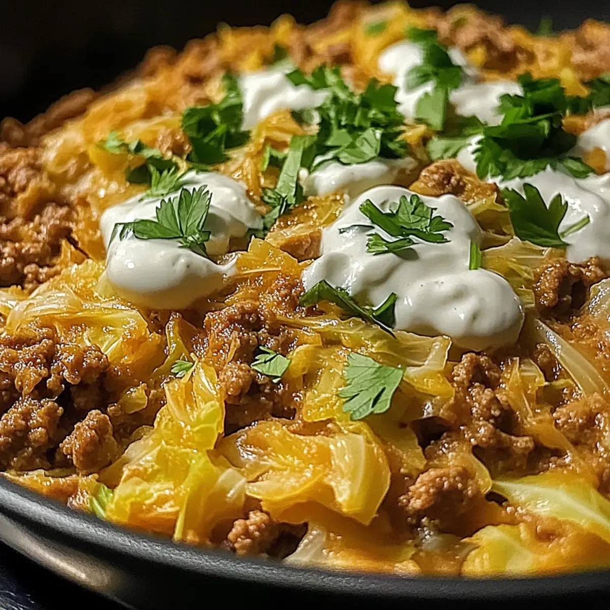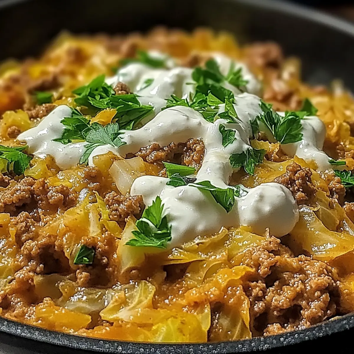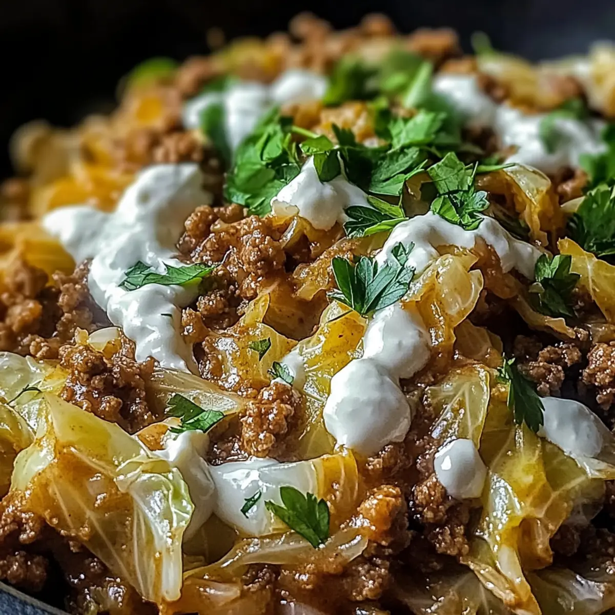 - Garnieren die fertige Bombastische Spitzkohl-Hackfleisch-Pfanne mit frischer Petersilie und serviere sie warm.