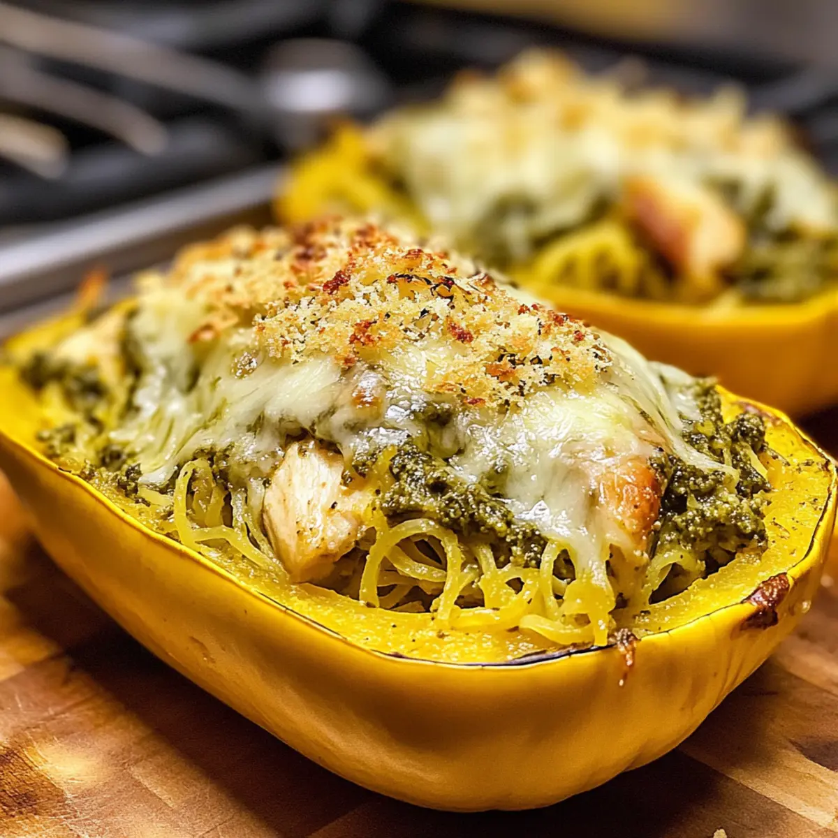 Überbackenes Pesto-Hühnchen-Spaghetti-Kürbis genießen