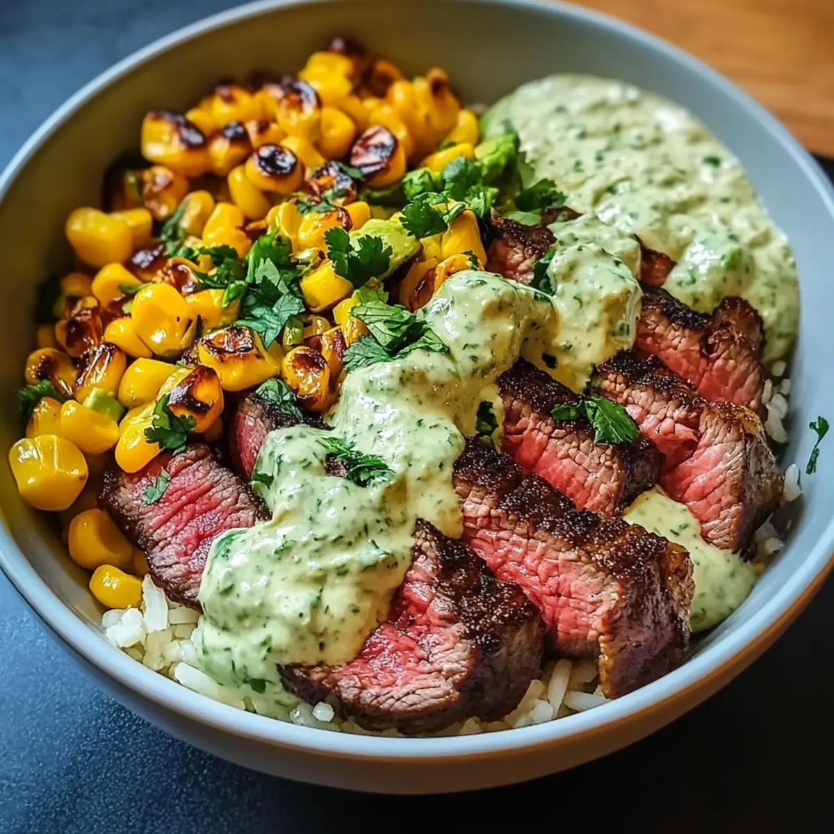Steak, Avocado und Mais-Bowl mit Koriander-Creme