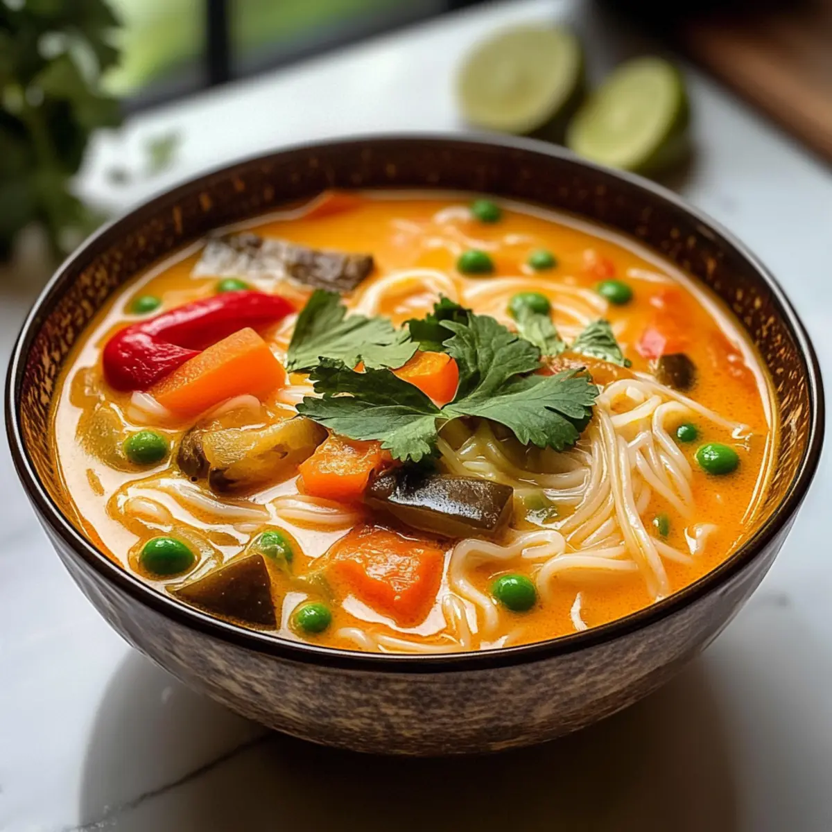 Asiatische Kokos-Curry-Suppe mit Reisnudeln genießen