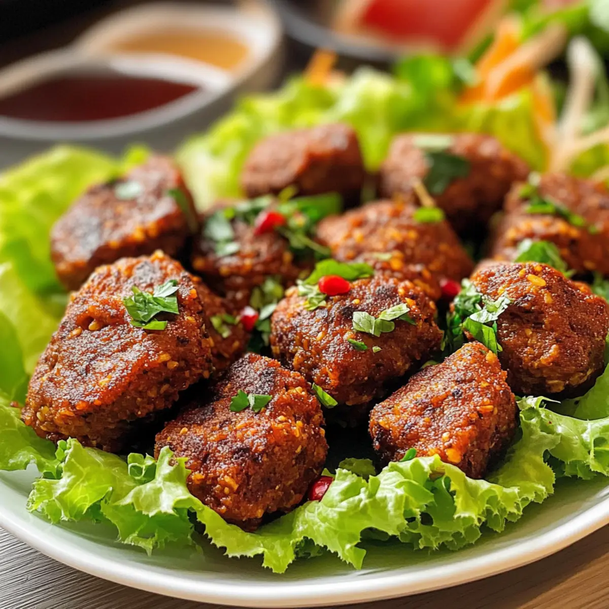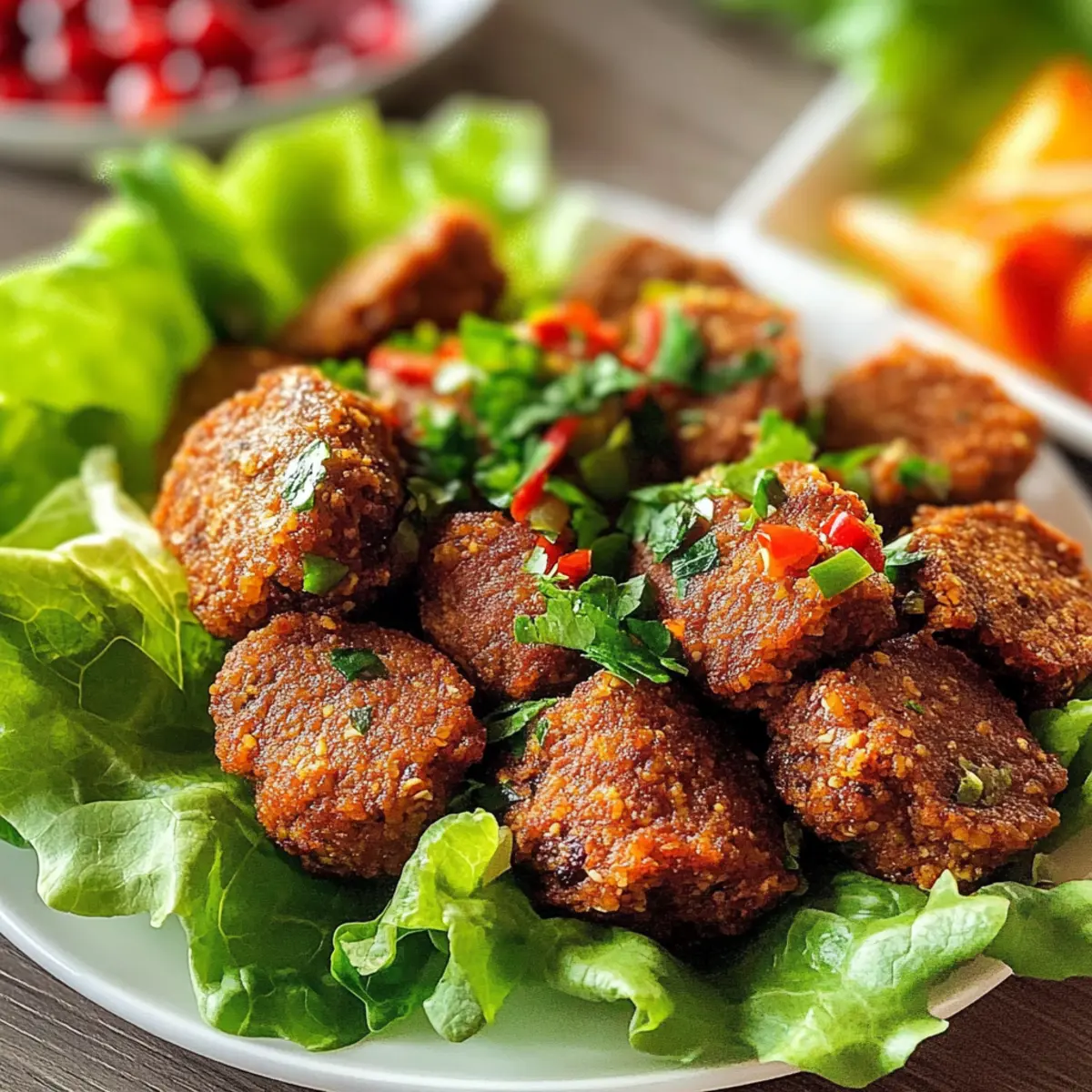Serviere die Cig Köfte auf frischen Eisbergsalat-Blättern für einen zusätzlichen Crunch. Ein Drizzle aus Granatapfelmolasse oder etwas frisch gepresster Zitrone sorgt für eine fruchtige Note. Diese Kombination macht die Präsentation besonders einladend und geschmackvoll.