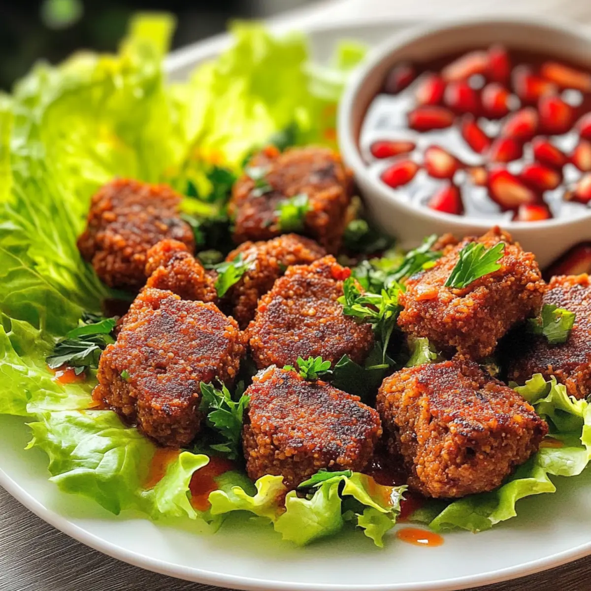 Platziere die fertigen Cig Köfte auf einem großen Teller, der mit frischen Eisbergsalat-Blättern ausgelegt ist. Drizzle optional etwas Granatapfelmolasse und frisch gepressten Zitronensaft über die Köfte, was einen herrlichen, süß-sauren Geschmack hinzufügt. Die Köfte können auch in Fladenbrot serviert werden, um ein köstliches Fingerfood zu kreieren.