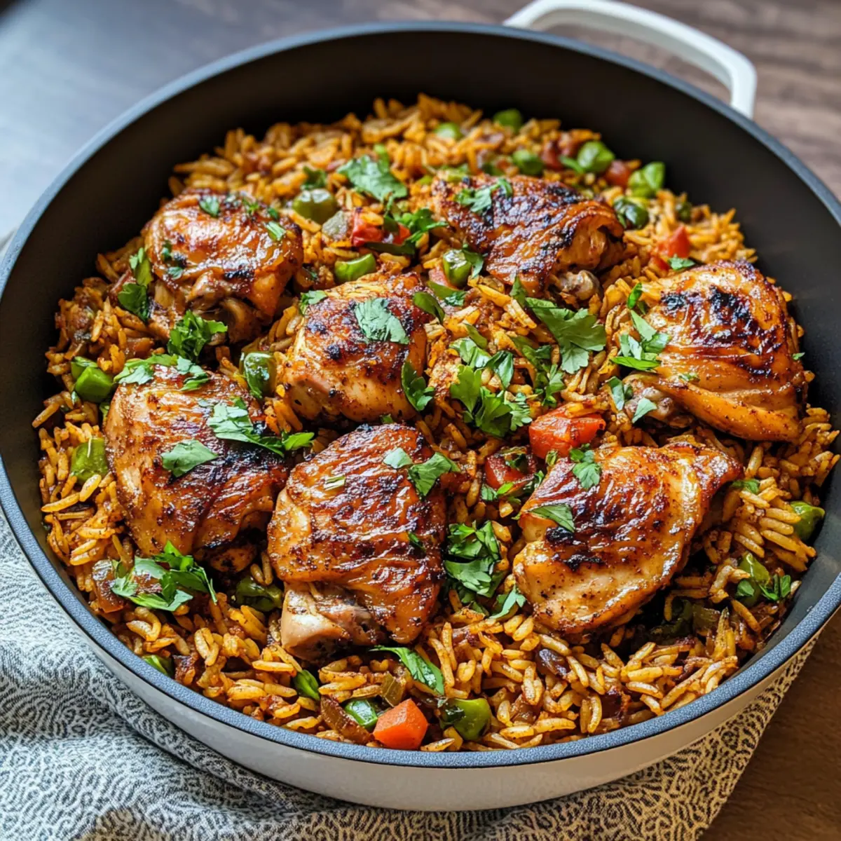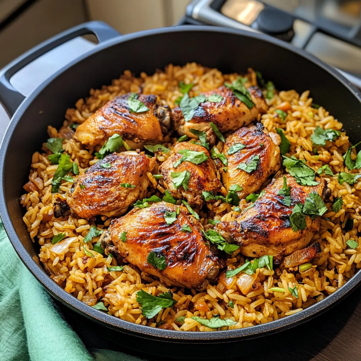 Lasse die Mischung auf mittlerer Hitze köcheln, bis die Brühe fast vollständig absorbiert ist, etwa 10 Minuten. Reduziere die Hitze, decke die Pfanne mit einem Deckel ab und lasse den Eintopf für zusätzliche 12 Minuten dämpfen, ohne den Deckel zu heben, bis der Reis gar und das Hähnchen zart ist.
