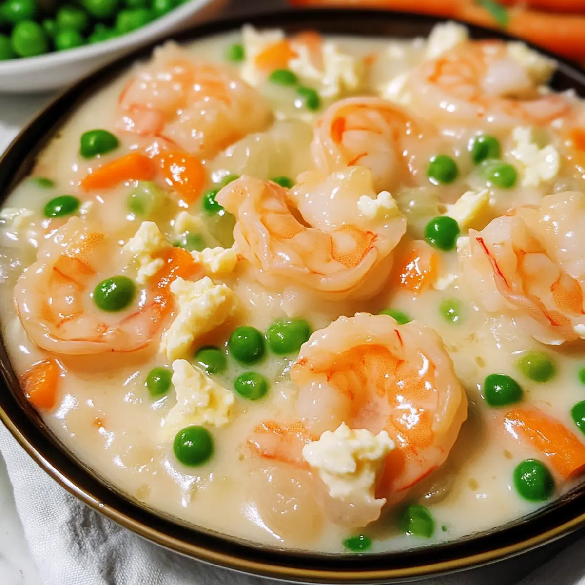 - Erbsen und Karotten in die Sauce fügen und die geschlagenen Eiklar langsam einrühren, um zarte Eiröllchen zu bilden.