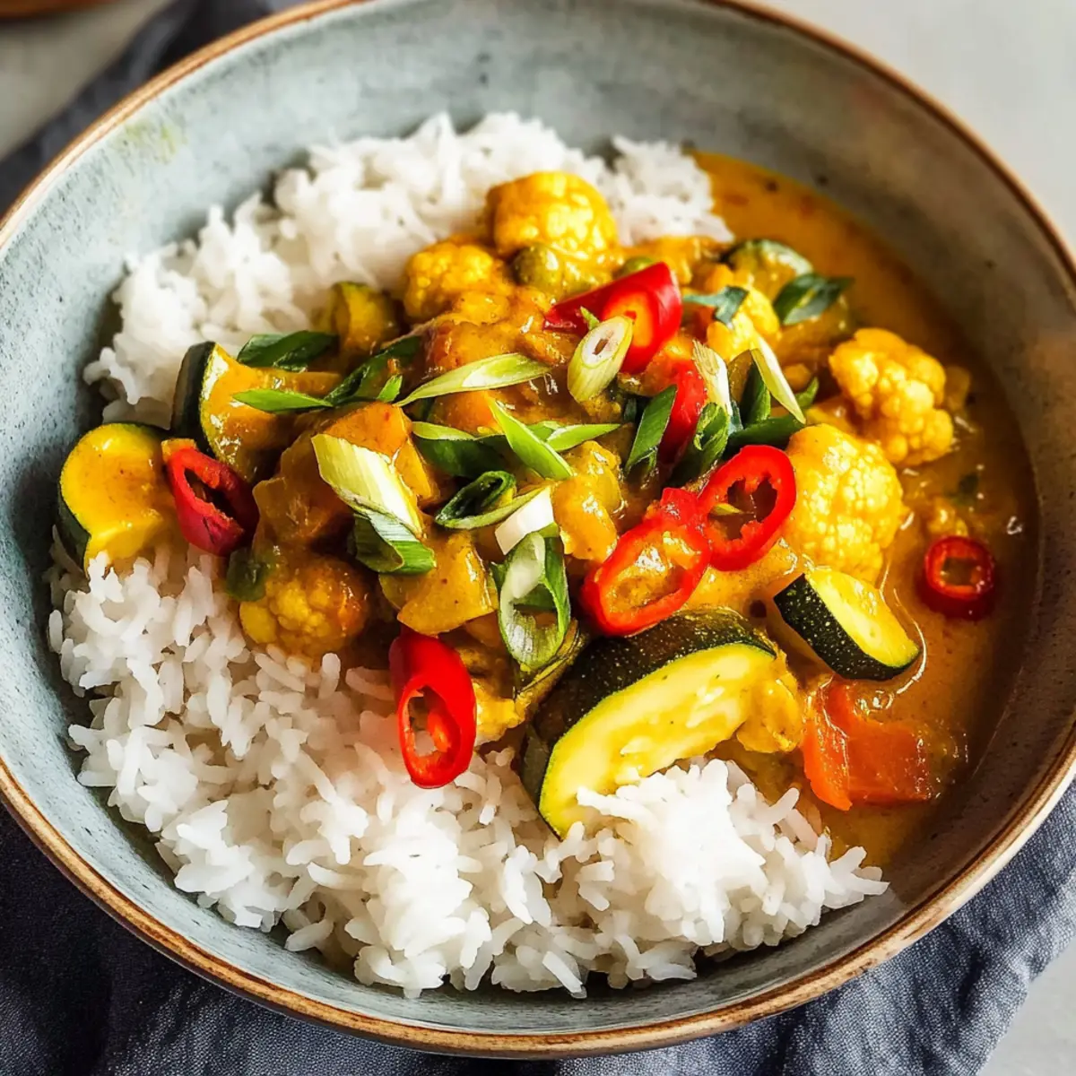 Serviere das Gemüsecurry über dem duftenden Reis. Garniere das Gericht mit frischen Frühlingszwiebeln und optional mit Chilischotenringen für zusätzlichen Pepp. So entsteht ein ansprechendes und köstliches Gericht, das deine Familie und Freunde begeistern wird.
