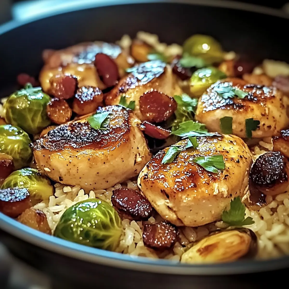 Hähnchen mit Reis, Rosenkohl und Speck in 40 Minuten