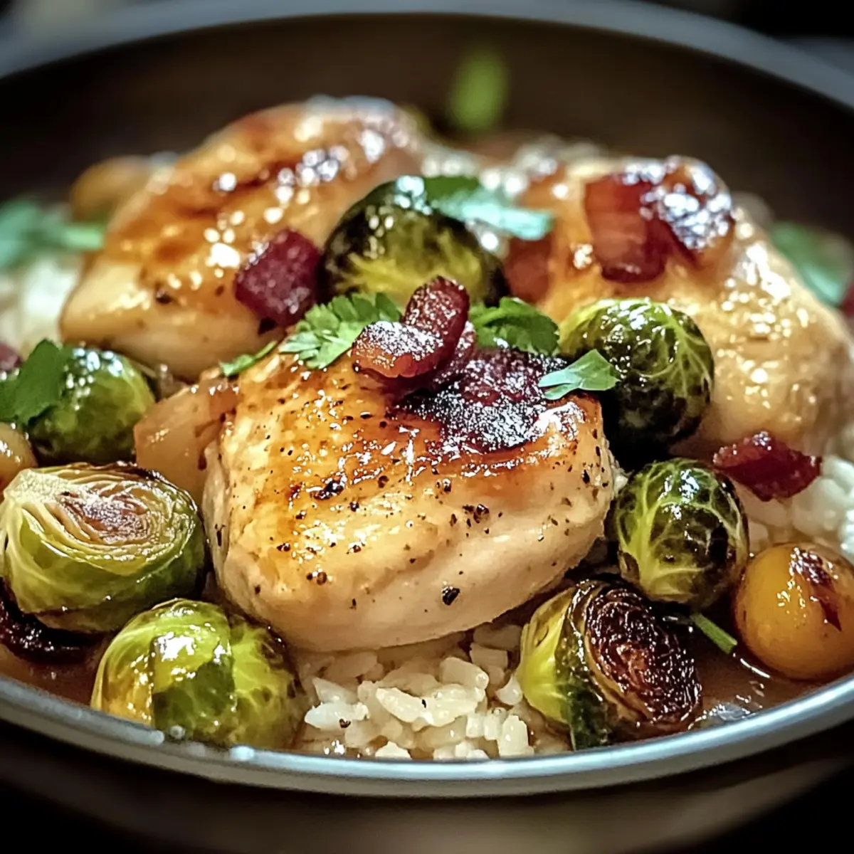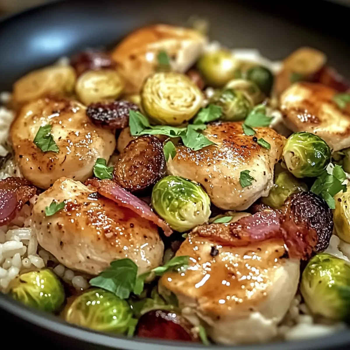 Herzhafter Geschmack: Die Kombination aus saftigem Hähnchen, knusprigem Speck und knackigem Rosenkohl ist unwiderstehlich.