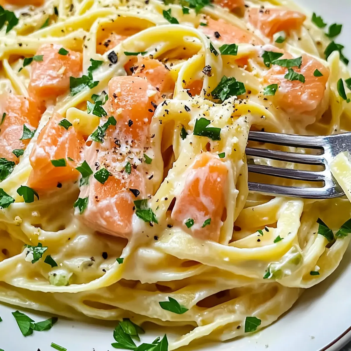 Richte die herzhafte geräucherte Lachs-Linguine auf Tellern an und garniere sie nach Belieben mit frischer Petersilie. Serviere sie heiß, um das volle Aroma der cremigen Sauce und des Lachs zu genießen. Diese schnelle Mahlzeit eignet sich perfekt für gesellige Abende oder ein entspanntes Dinner.