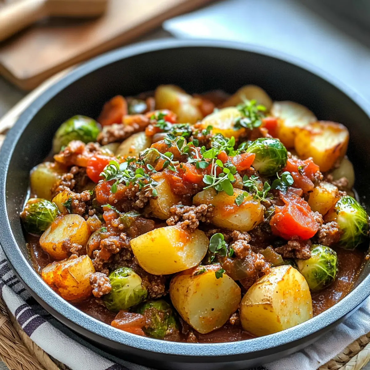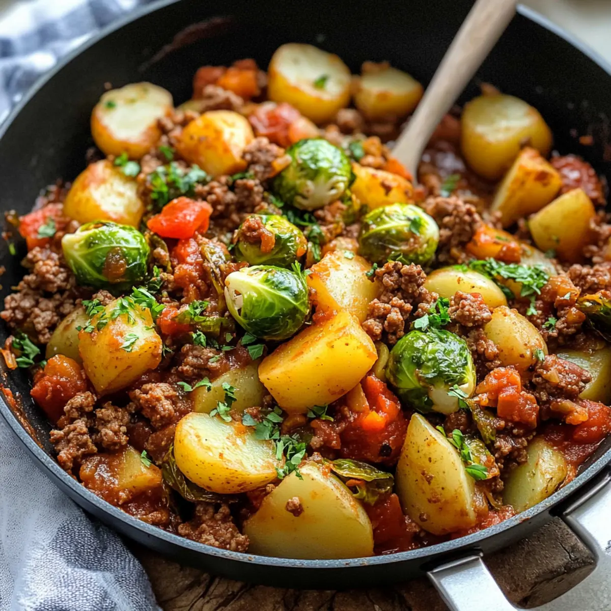 Einfache Zubereitung: Die One-Pot Kartoffel Rosenkohl Pfanne mit Hackfleisch ist unkompliziert und benötigt nur ein paar Grundtechniken, perfekt für jeden Koch.