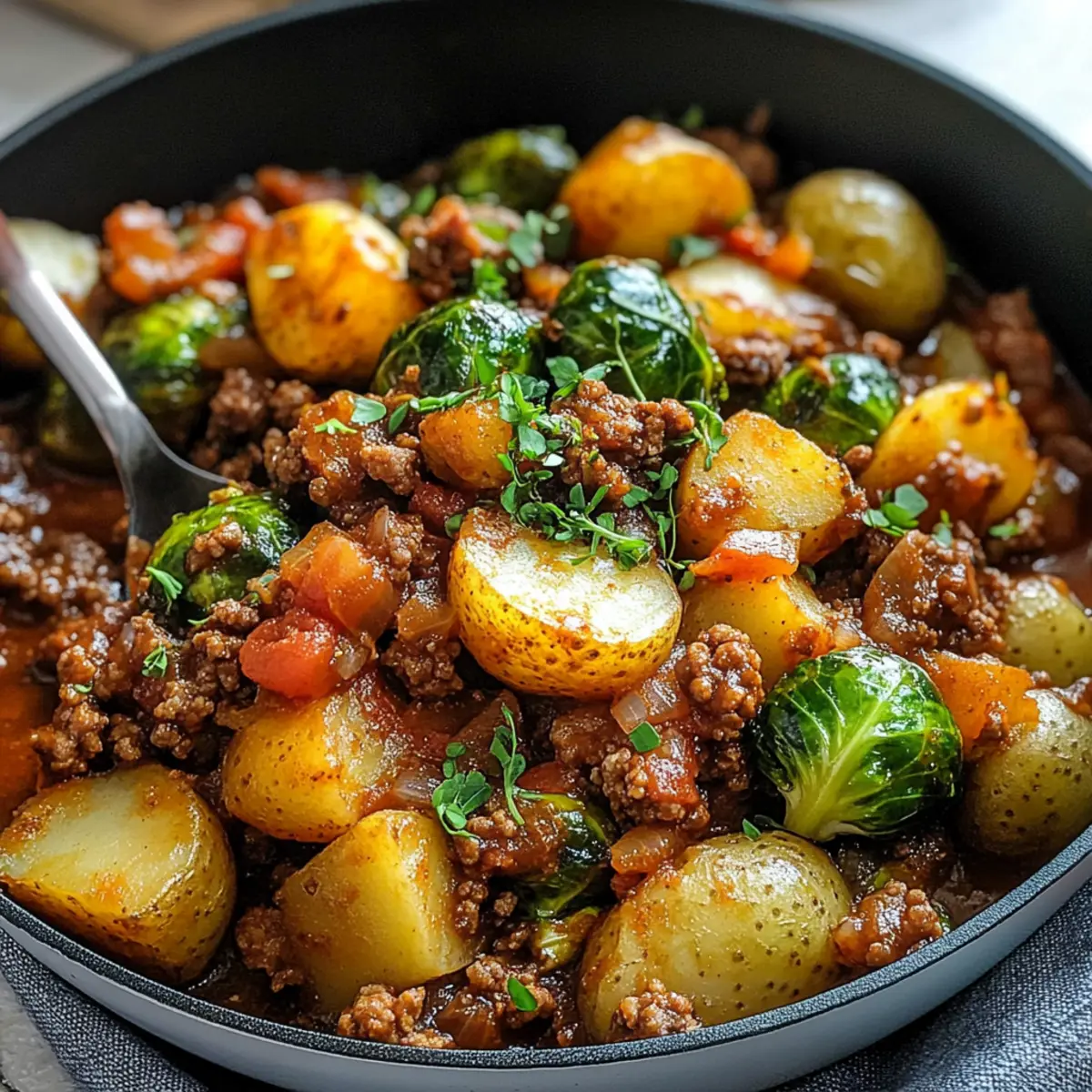 Diese Kartoffel Rosenkohl Pfanne mit Hackfleisch wird Ihre Familie begeistern und ist der perfekte Komfortfood-Klassiker für kalte Tage!