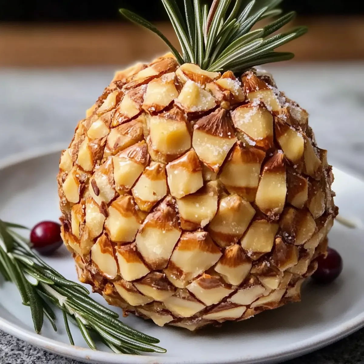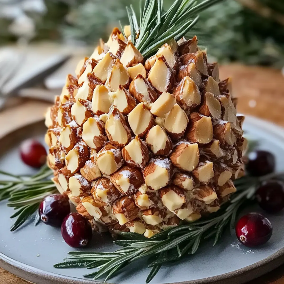 - Drücke die geschnittenen Mandeln in die Käseball-Oberfläche, um die Schuppen einer Kiefernnuss nachzubilden.