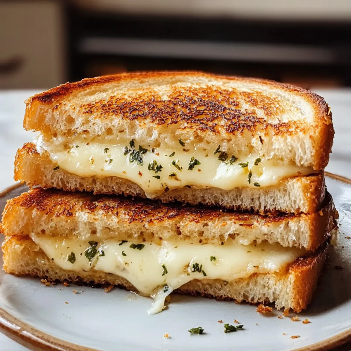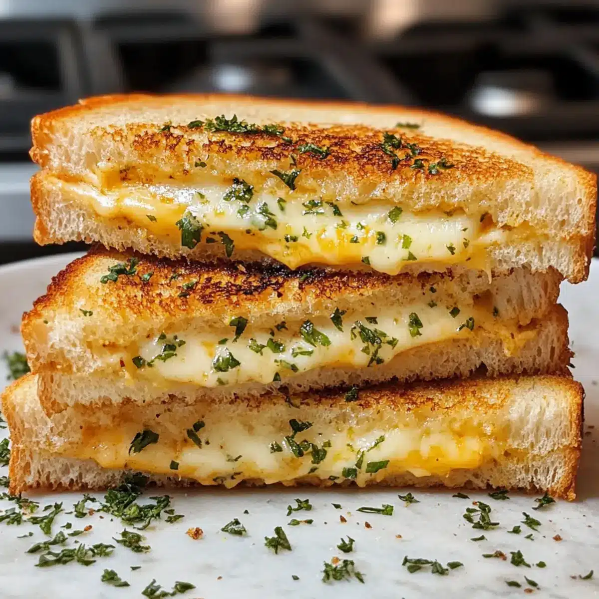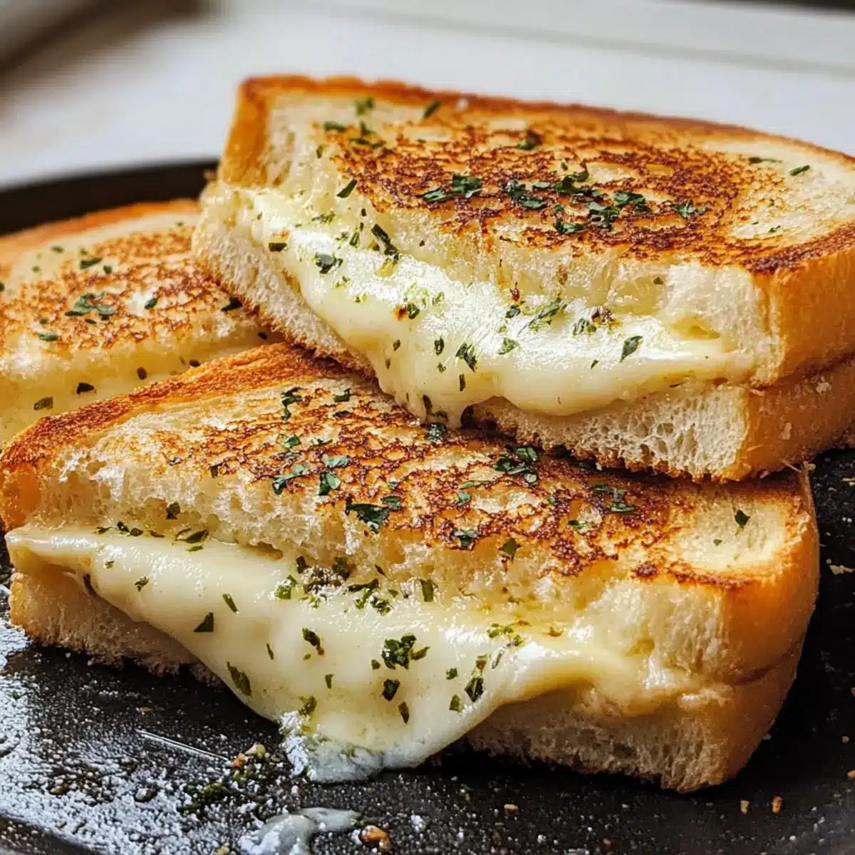 Brate die Sandwiches bei mittlerer Hitze für etwa 3-4 Minuten, bis die Unterseite goldbraun und knusprig ist. Überprüfe regelmäßig die Farbe, um sicherzustellen, dass die Knoblauchbutter nicht verbrennt, während der Käse zu schmelzen beginnt. Dies sorgt für eine perfekte Kombination von Texturen – knusprig außen und schmelzend innen.