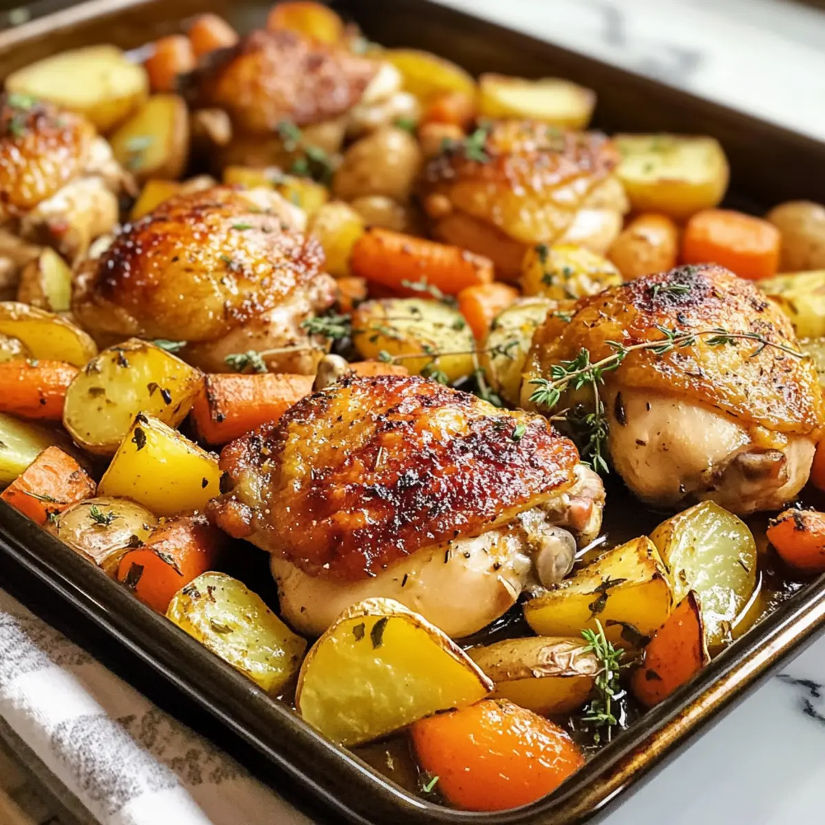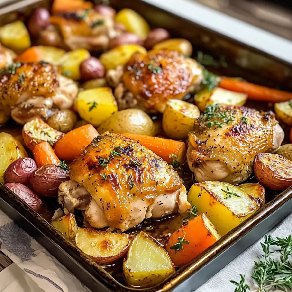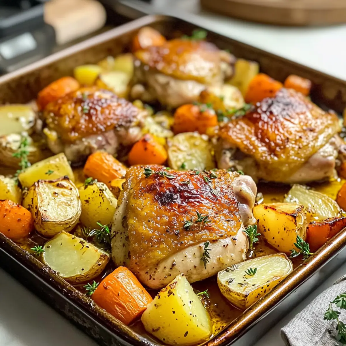 Einfachheit pur: Die Zubereitung dieser knusprigen Blechpfannen-Hühnchenoberschenkel erfordert nur wenige Schritte und dauert weniger als eine Stunde.
