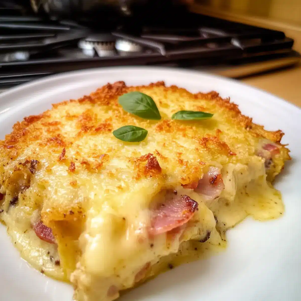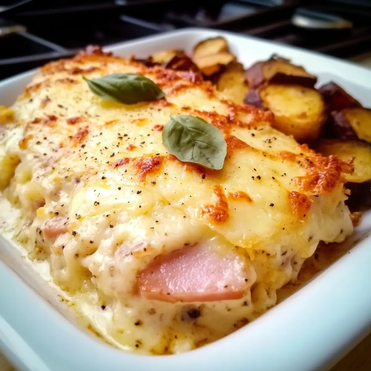 Gemüse-Boost: Füge frischen Spinat oder gebratene Paprika zwischen die Hähnchen- und Schinkenschichten hinzu. Dadurch erhält dein Auflauf mehr Nährstoffe und eine schöne Farbvielfalt.