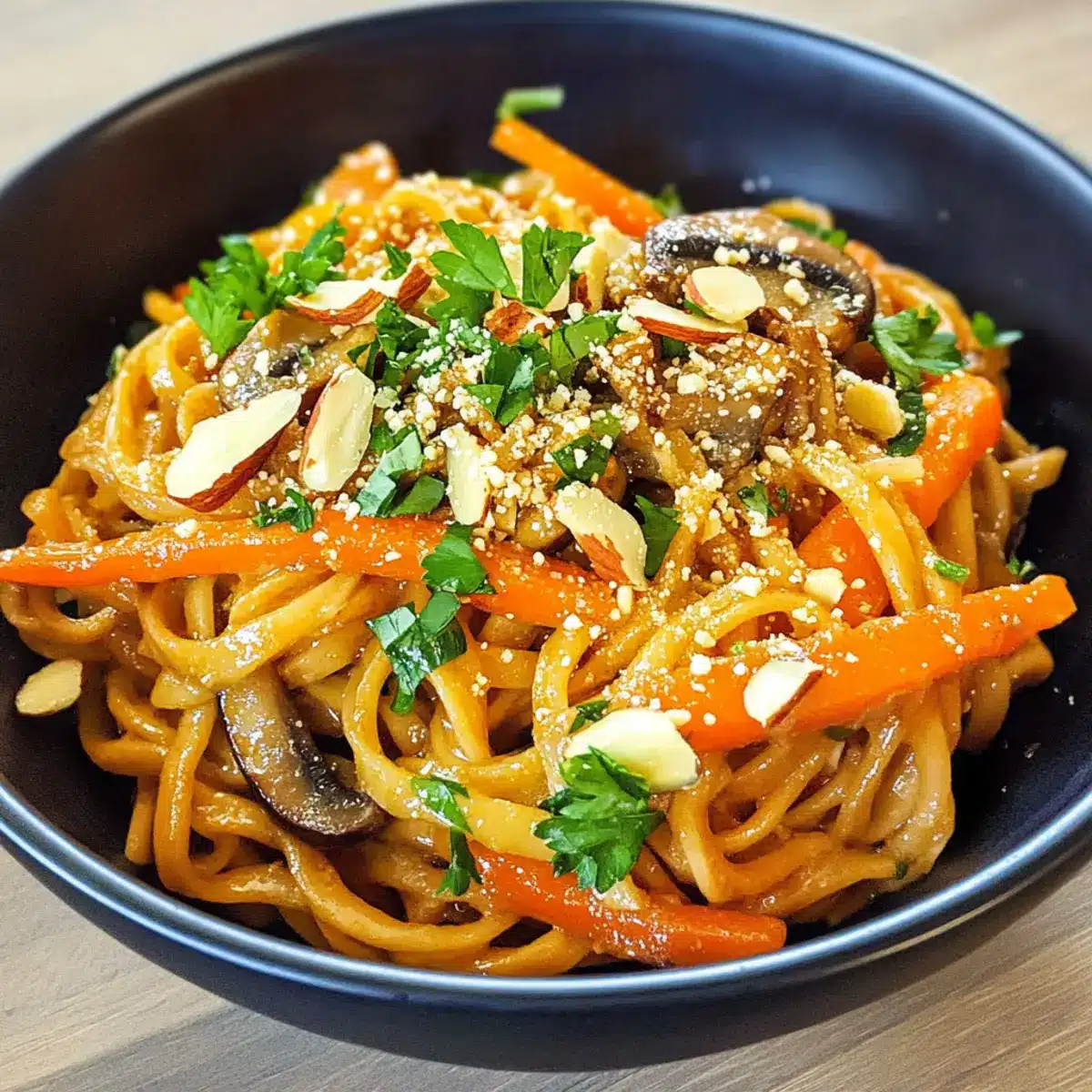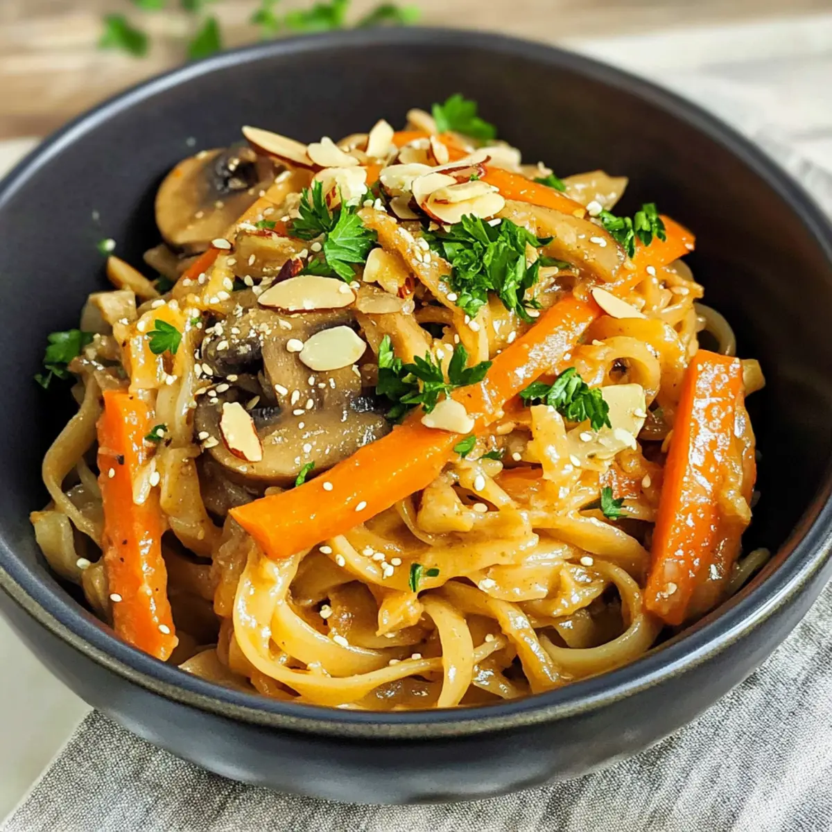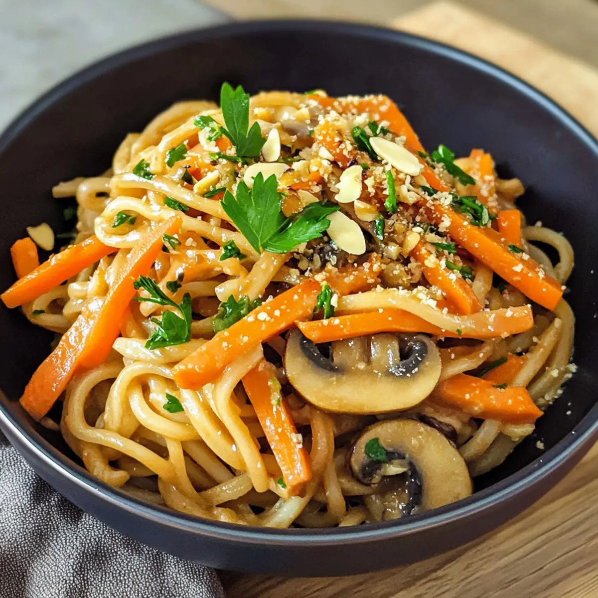 Genieße deine köstlichen Nudeln mit Möhren, Champignons und Miso-Mandelsoße!