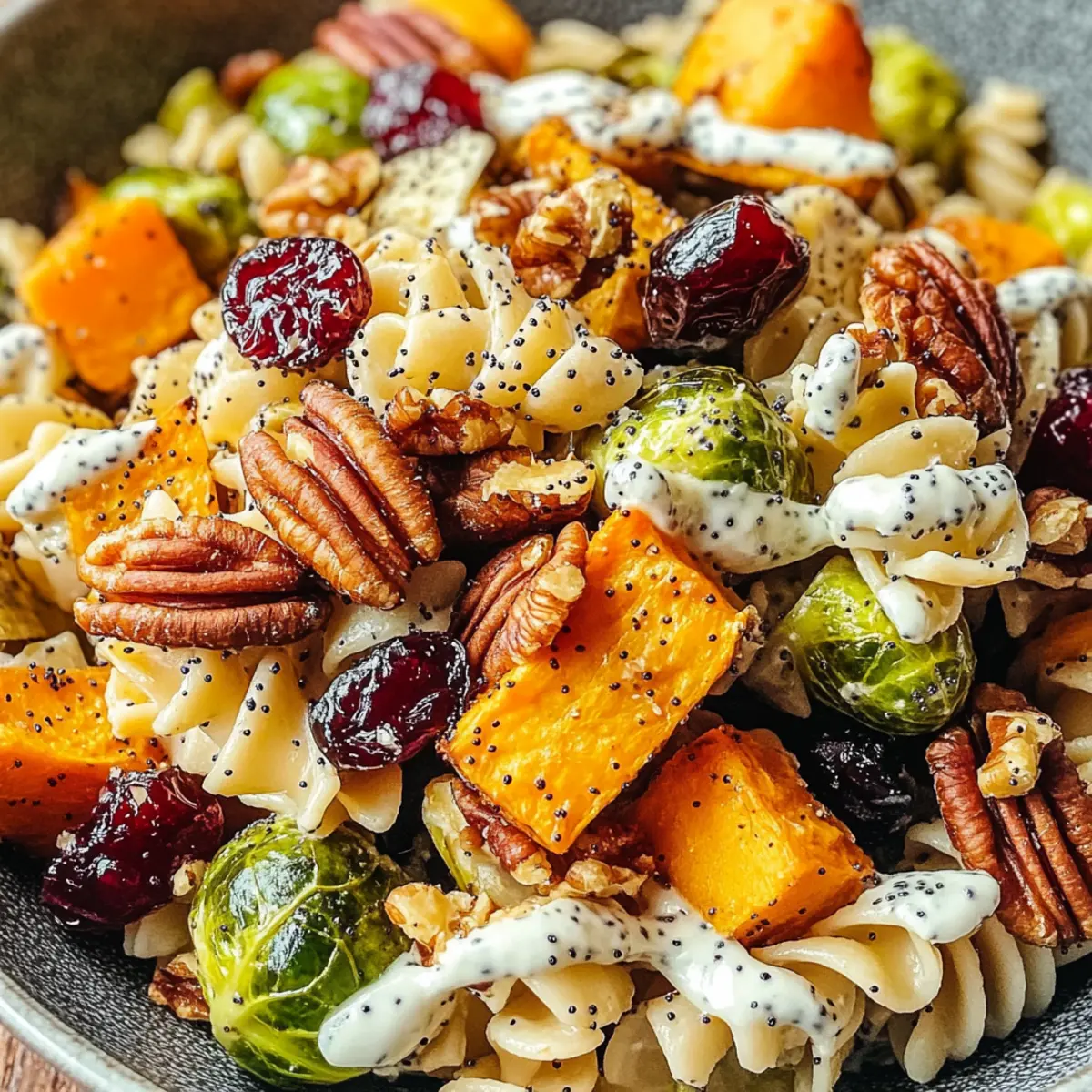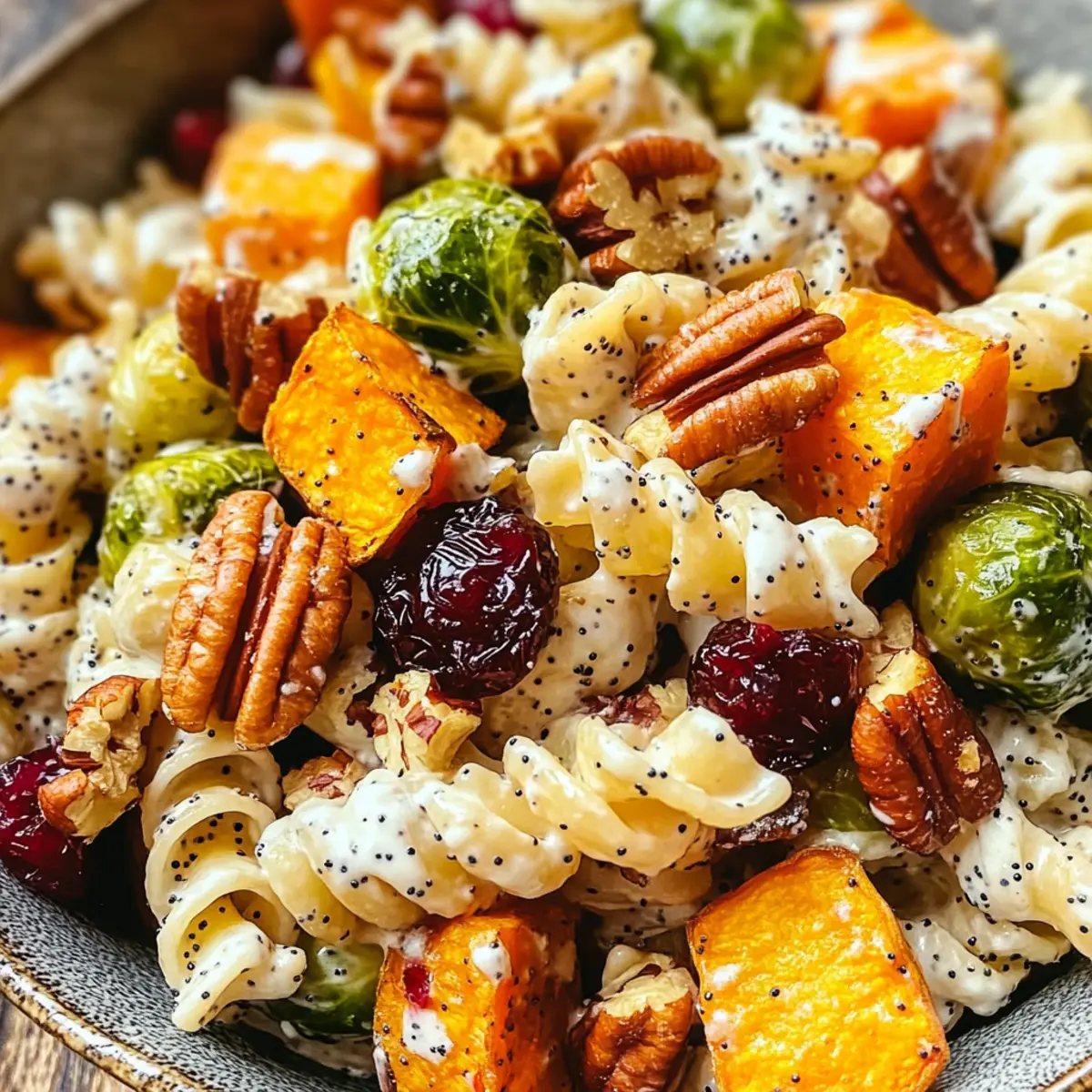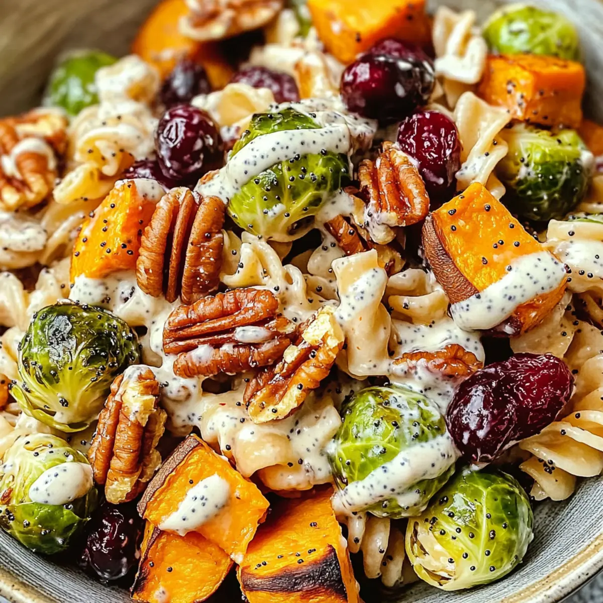 Ein leuchtend bunter Nudelsalat ist der perfekte Begleiter für gemütliche Herbsttage, wenn die Blätter sich in goldene Töne verwandeln. Der herzhafte Nudelsalat mit cremiger Mohnsauce für den Herbst vereint gerösteten Rosenkohl, süße Süßkartoffeln, nussige Pekannüsse und fruchtige Cranberries zu einem optischen und geschmacklichen Erlebnis. Diese Kombination ist nicht nur äußerst vielseitig, sondern auch ideal für festliche Anlässe oder als nahrhaftes Mittagessen. Dabei punktet dieses Rezept mit einer schnellen Zubereitungszeit – perfekt für alle, die sich eine gesunde und köstliche Mahlzeit ohne großen Aufwand wünschen. Und das Beste: Für Veganer gibt es eine unkomplizierte Anpassung! Neugierig, wie du mit frischen Zutaten und einer milden, cremigen Sauce neue Geschmackshorizonte erschließen kannst?