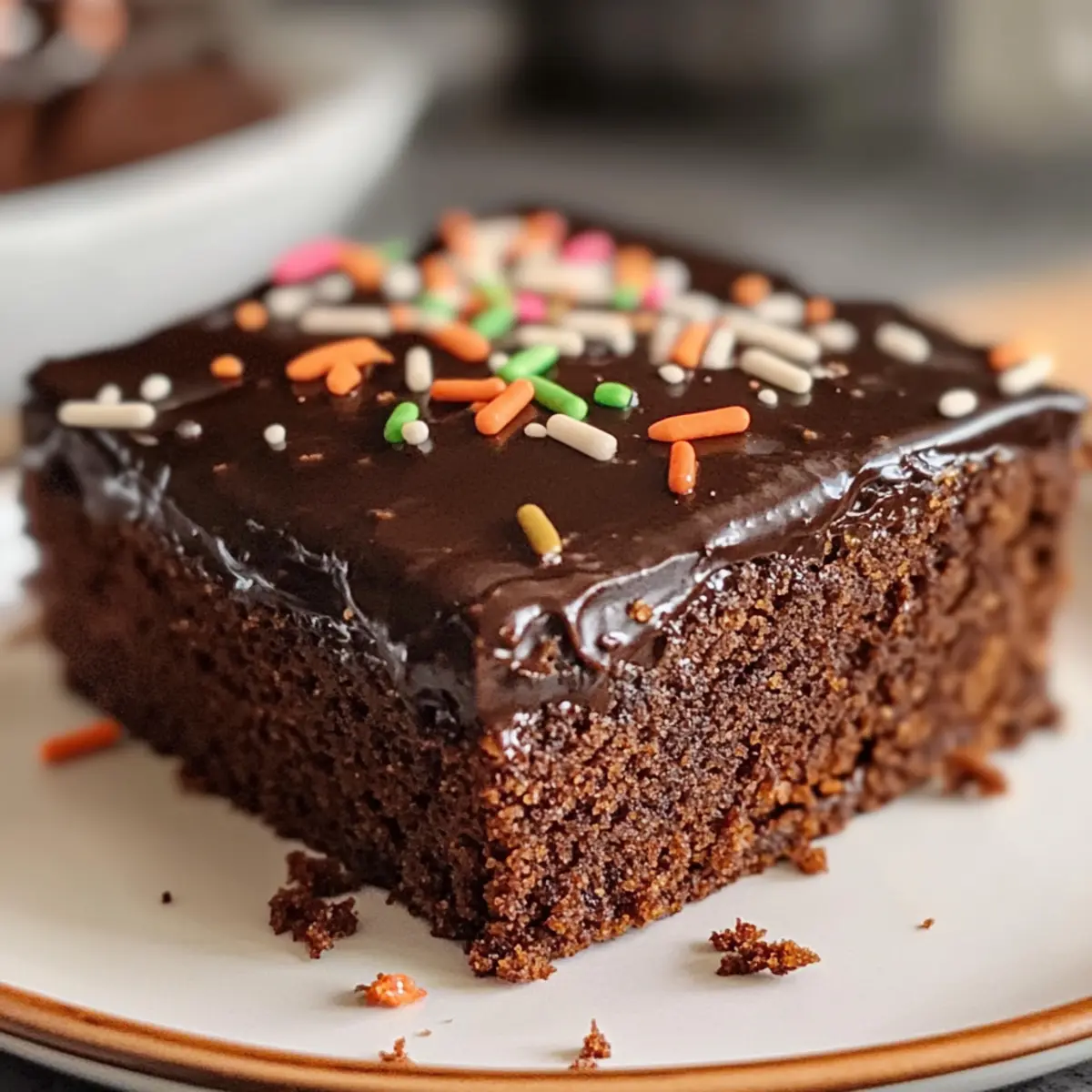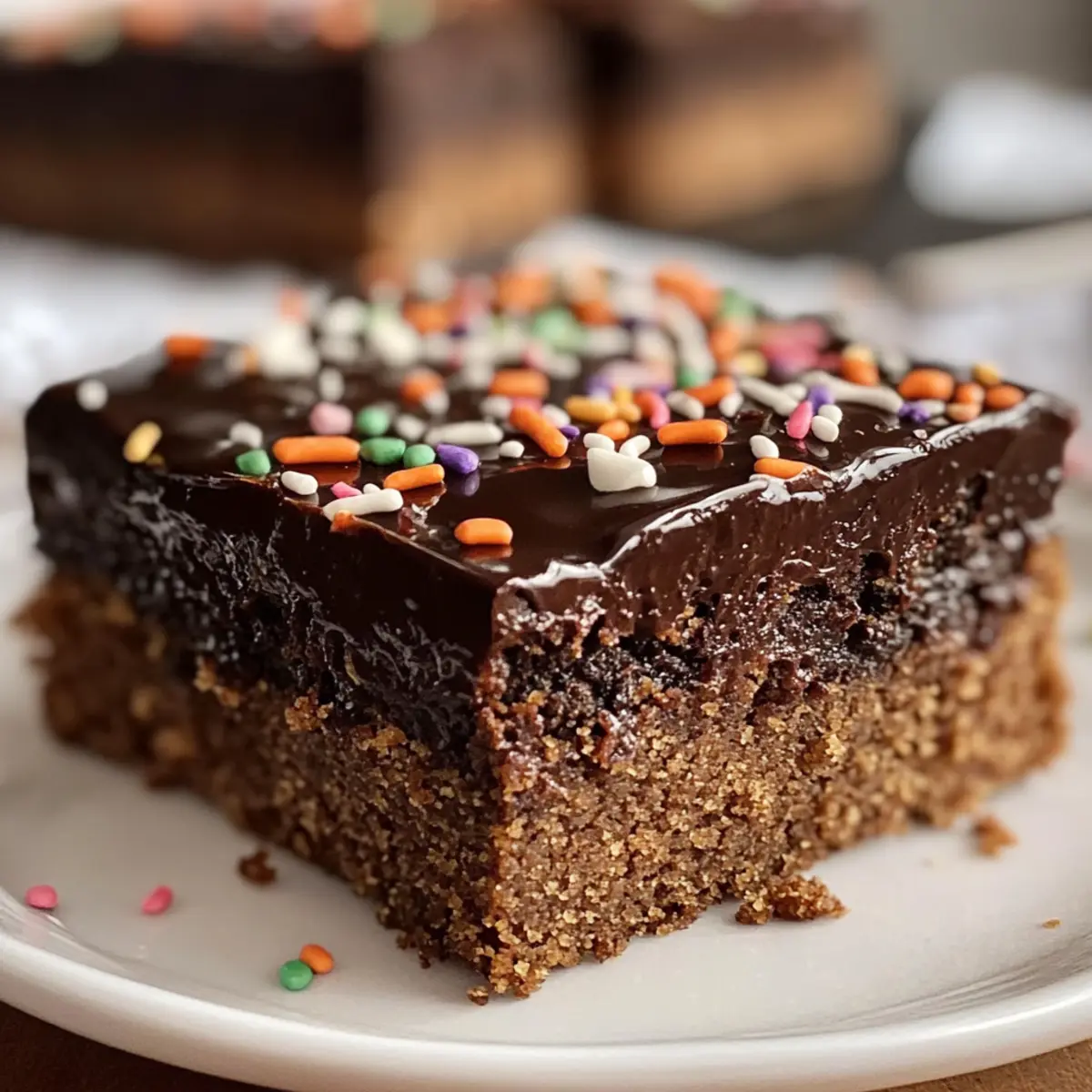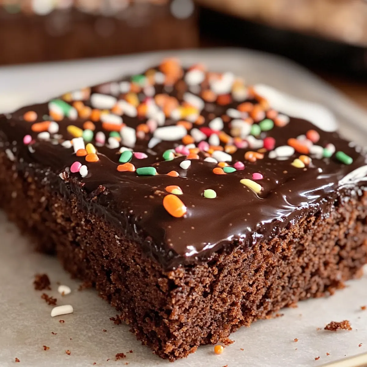 Lass den Kuchen auf einem Kuchengitter vollständig abkühlen. In der Zwischenzeit kannst du die zartbittere Schokolade schmelzen und bereitstellen. Sobald der Kuchen kalt ist, die geschmolzene Schokolade gleichmäßig darauf verteilen und nach Belieben mit Schokostreuseln dekorieren.