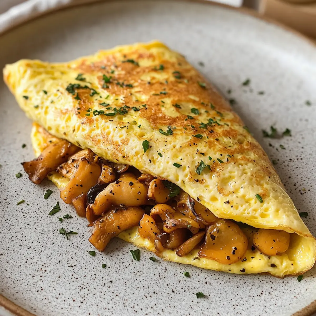 Köstliche Textur: Das fluffige Omelett kombiniert sich perfekt mit den leicht gebräunten Pfifferlingen, was ein außergewöhnliches Genusserlebnis schafft.