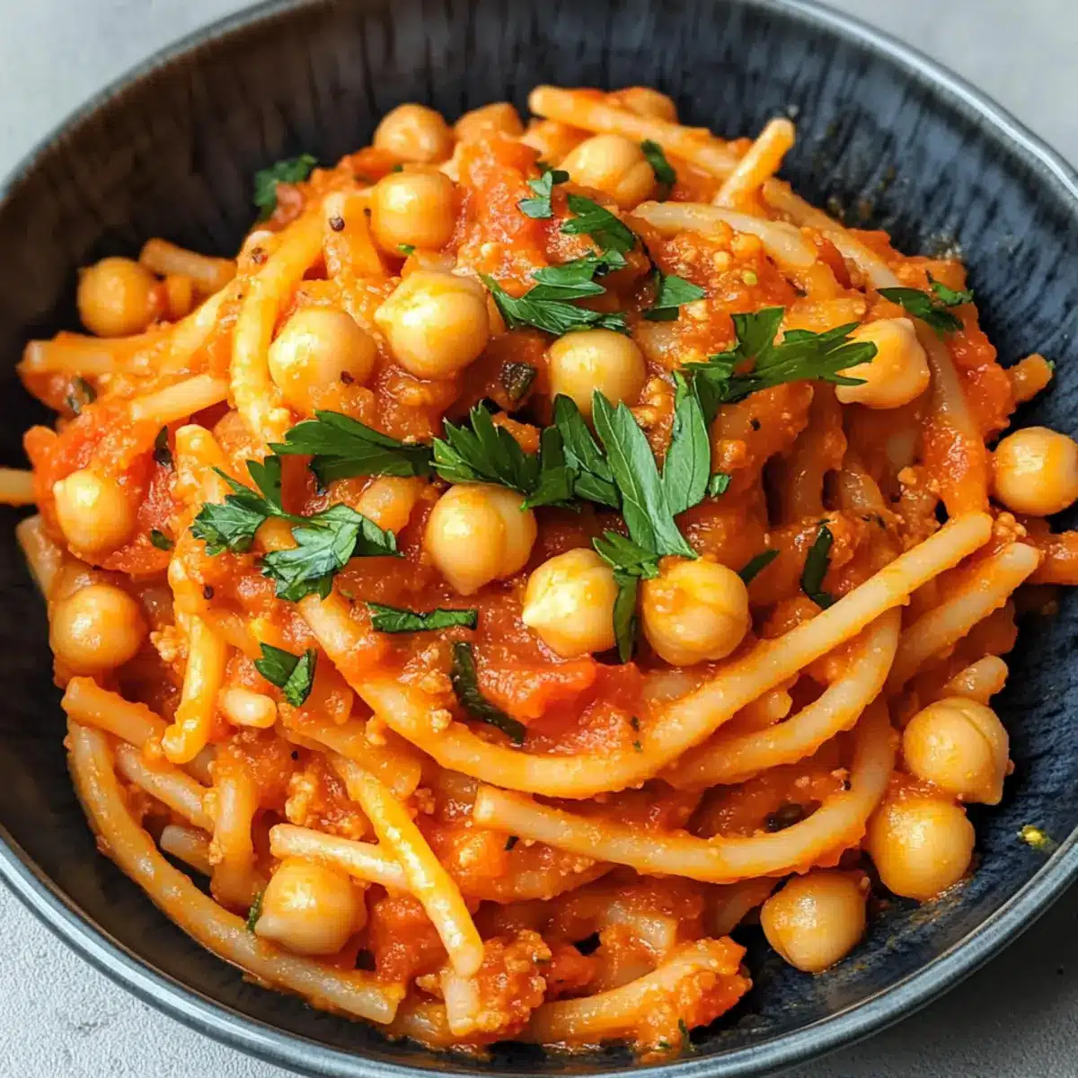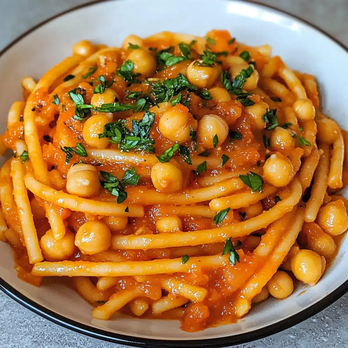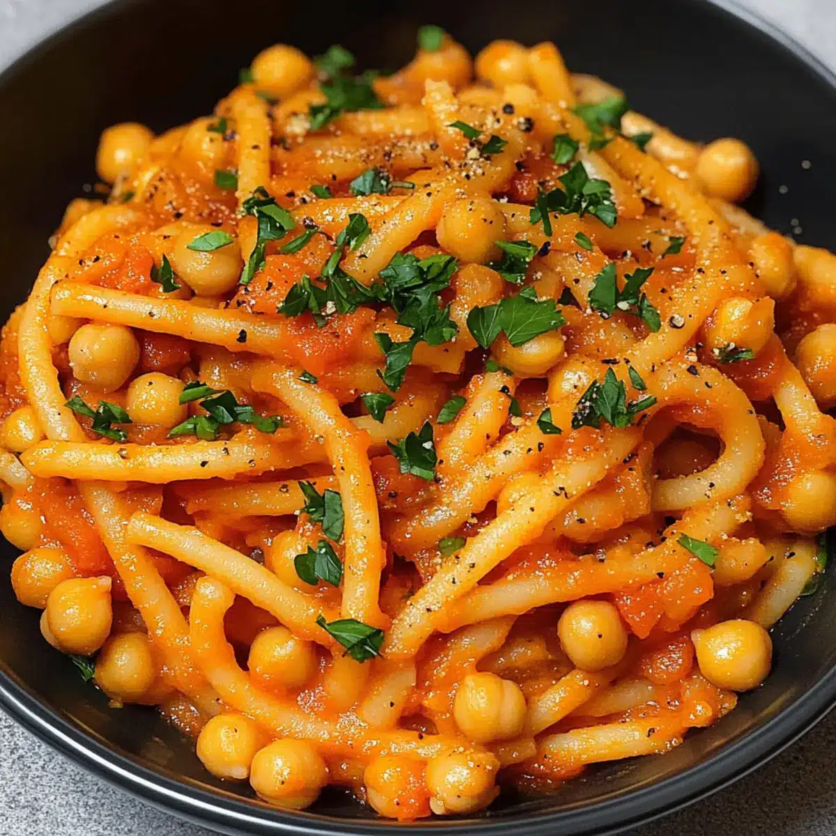Herzhafter Genuss: Der reichhaltige Geschmack von Kichererbsen vereint sich perfekt mit der Pasta und dem Tomatenmark zu einem absoluten Lieblingsgericht.