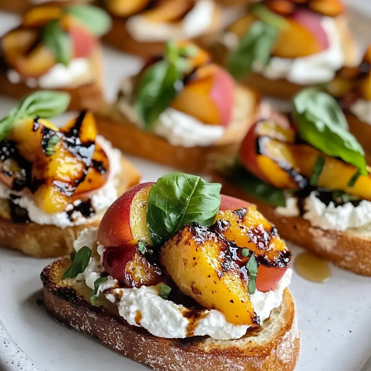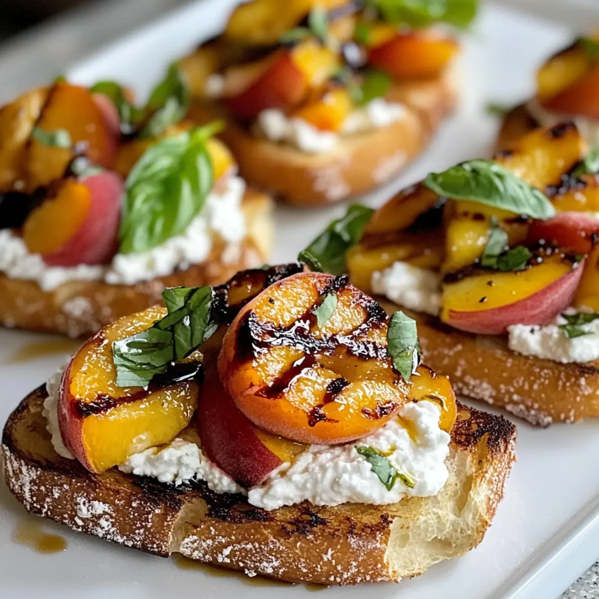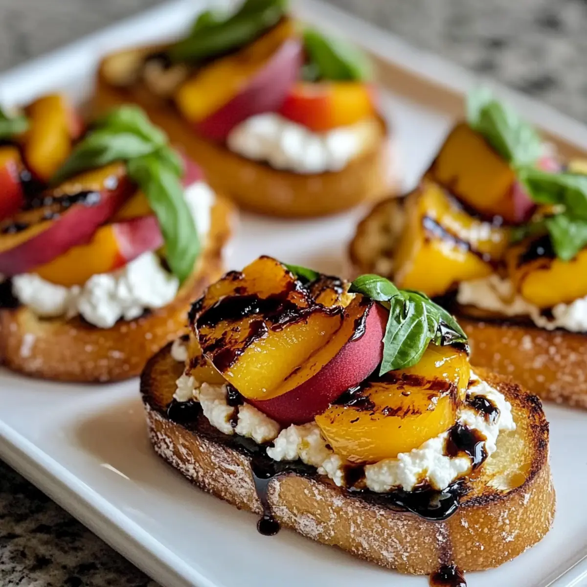 - Verteile die aufgeschlagene Ricotta auf jeder gerösteten Baguettescheibe. Platziere die gegrillten Pfirsichspalten darauf, gefolgt von frischem Basilikum und beträufle mit Balsamico-Glasur.