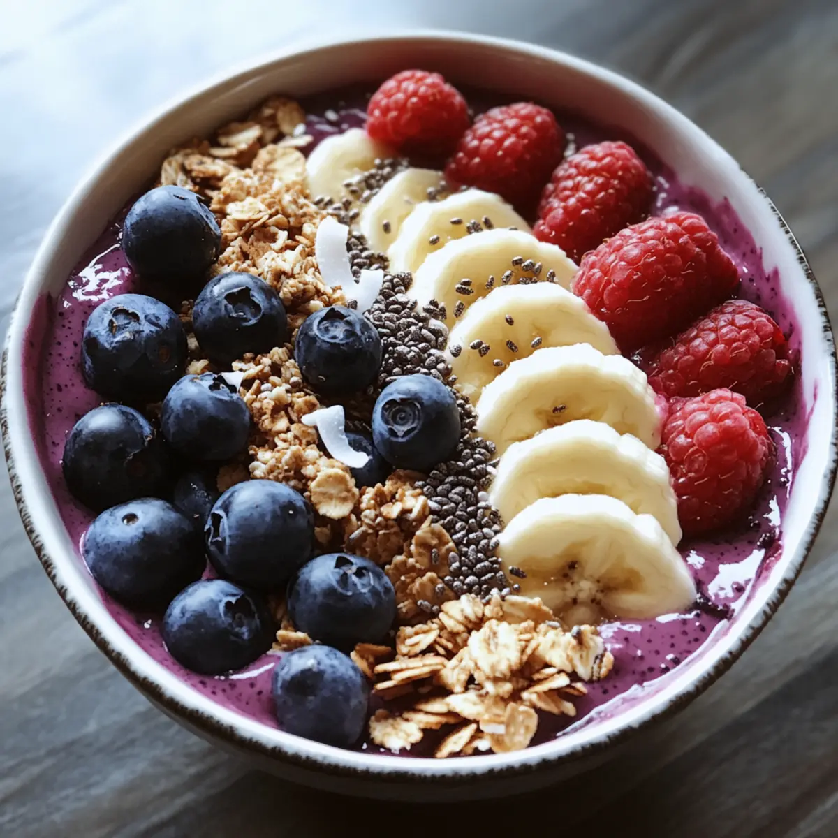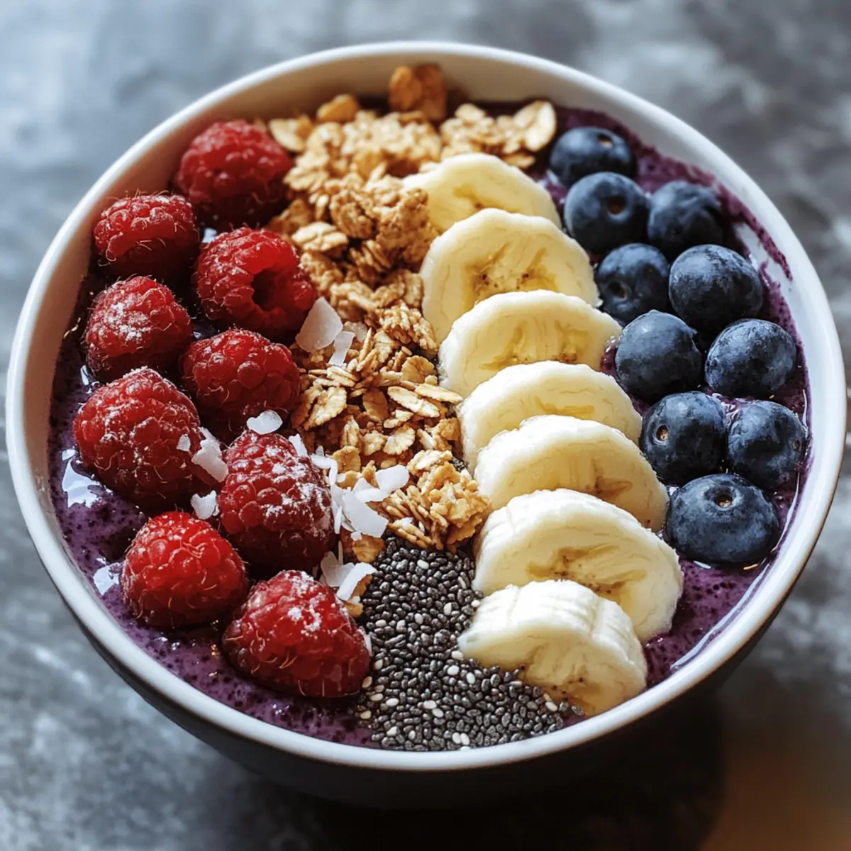 - Streue das Granola, die Beeren, die restlichen Bananenscheiben und die Chiasamen gleichmäßig über die Acai-Basis.
