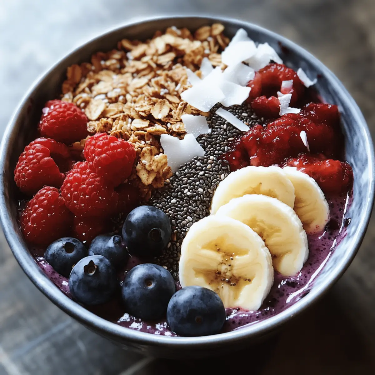Streue das Granola gleichmäßig über die Acai-Basis, gefolgt von frischen Beeren, den restlichen Bananenscheiben und den Chiasamen. Du kannst die Menge nach Belieben anpassen und kreativ werden! Denke daran, Farben zu kombinieren, um eine optisch ansprechende Protein Acai Schüssel zu kreieren.