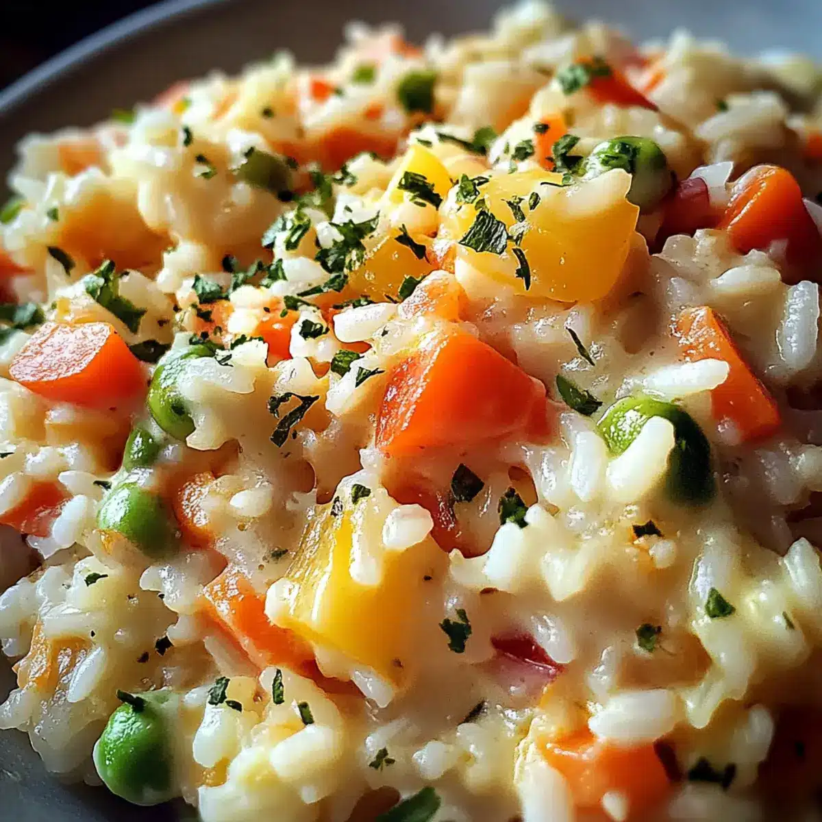 Gegrilltes Hühnchen: Für eine proteinreiche Option, füge gegrilltes Hühnchen hinzu. Das zarte Fleisch harmoniert köstlich mit dem cremigen Gemüse-Reis.