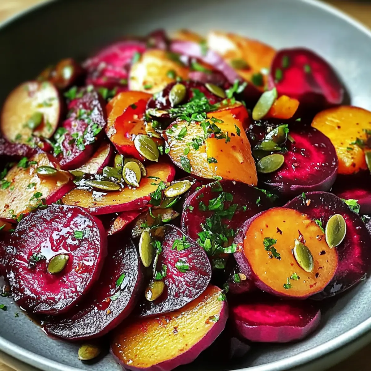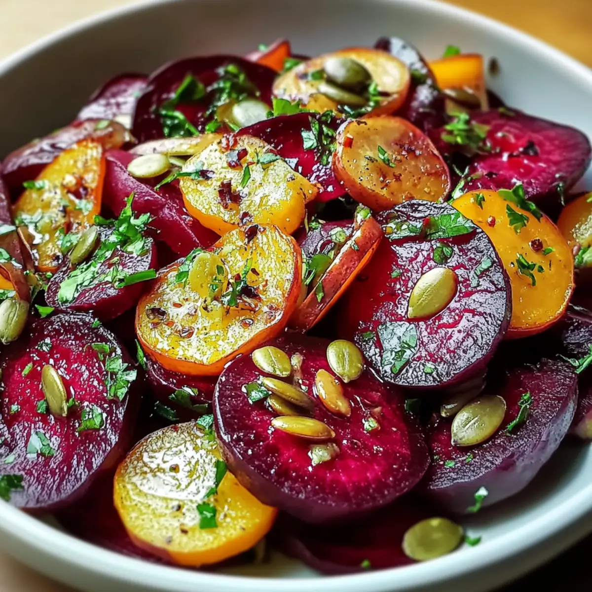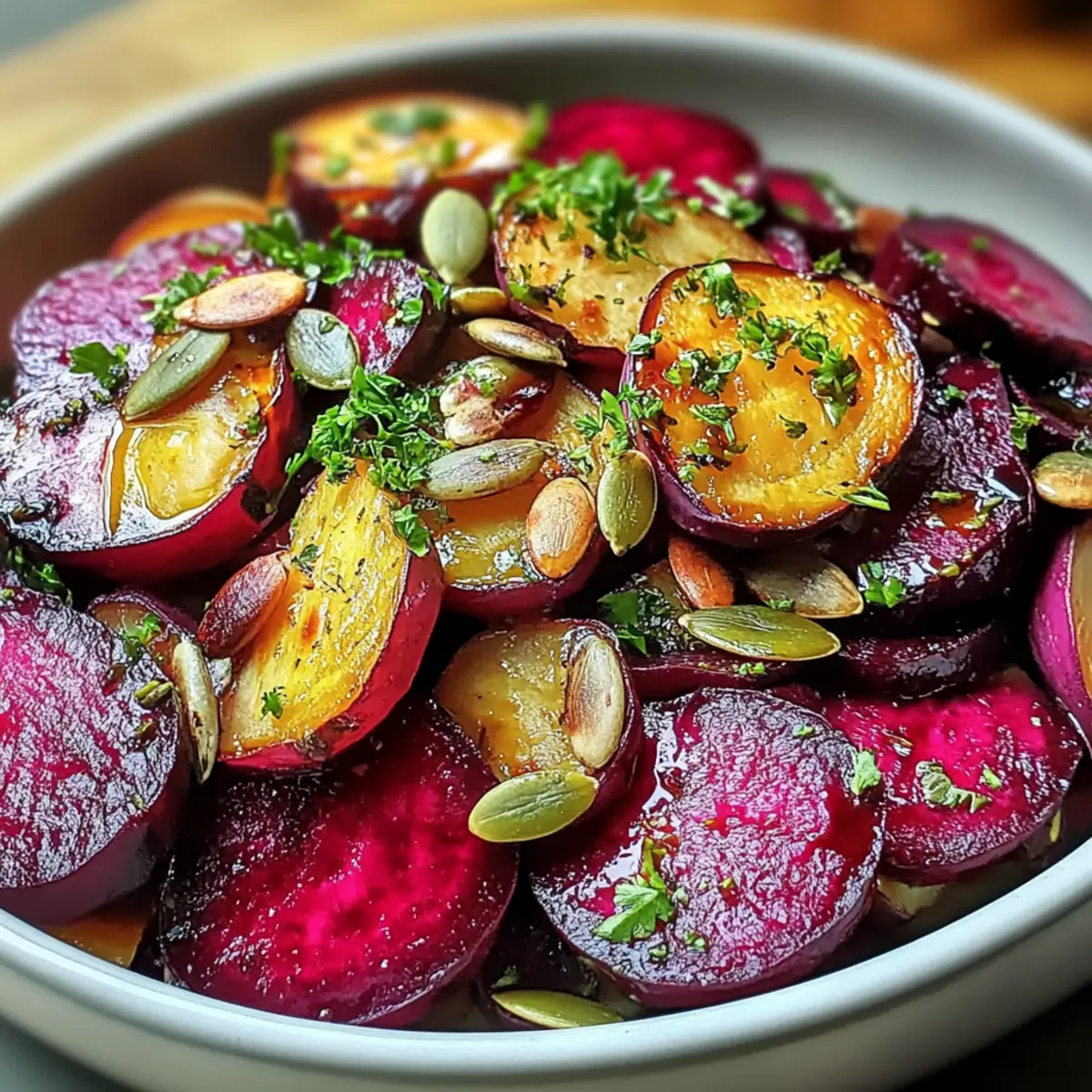 Der Rote-Bete-Salat mit frischem Meerrettich ist ideal für die Vorbereitung im Voraus! Sie können die Rüben bis zu 24 Stunden im Voraus rösten und in einem luftdichten Behälter im Kühlschrank aufbewahren, um die frische Süße zu bewahren. Die Kürbiskerne können ebenfalls vorbereitet und in einem separaten Behälter aufbewahrt werden, um ihre Knusprigkeit zu erhalten. Wenn es Zeit ist, zu servieren, mischen Sie einfach die Rüben mit dem gerösteten Meerrettich und den Kürbiskernen und beträufeln Sie alles mit Kürbiskernöl und Balsamico-Essig. Ein kurzer Tipp: Lassen Sie den Salat nach der Zubereitung einige Minuten ruhen, damit sich die Aromen entfalten können – so genießen Sie ein ebenso köstliches Geschmackserlebnis wie frisch zubereitet!