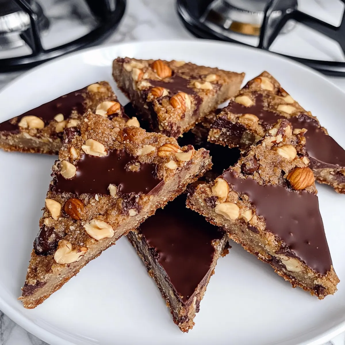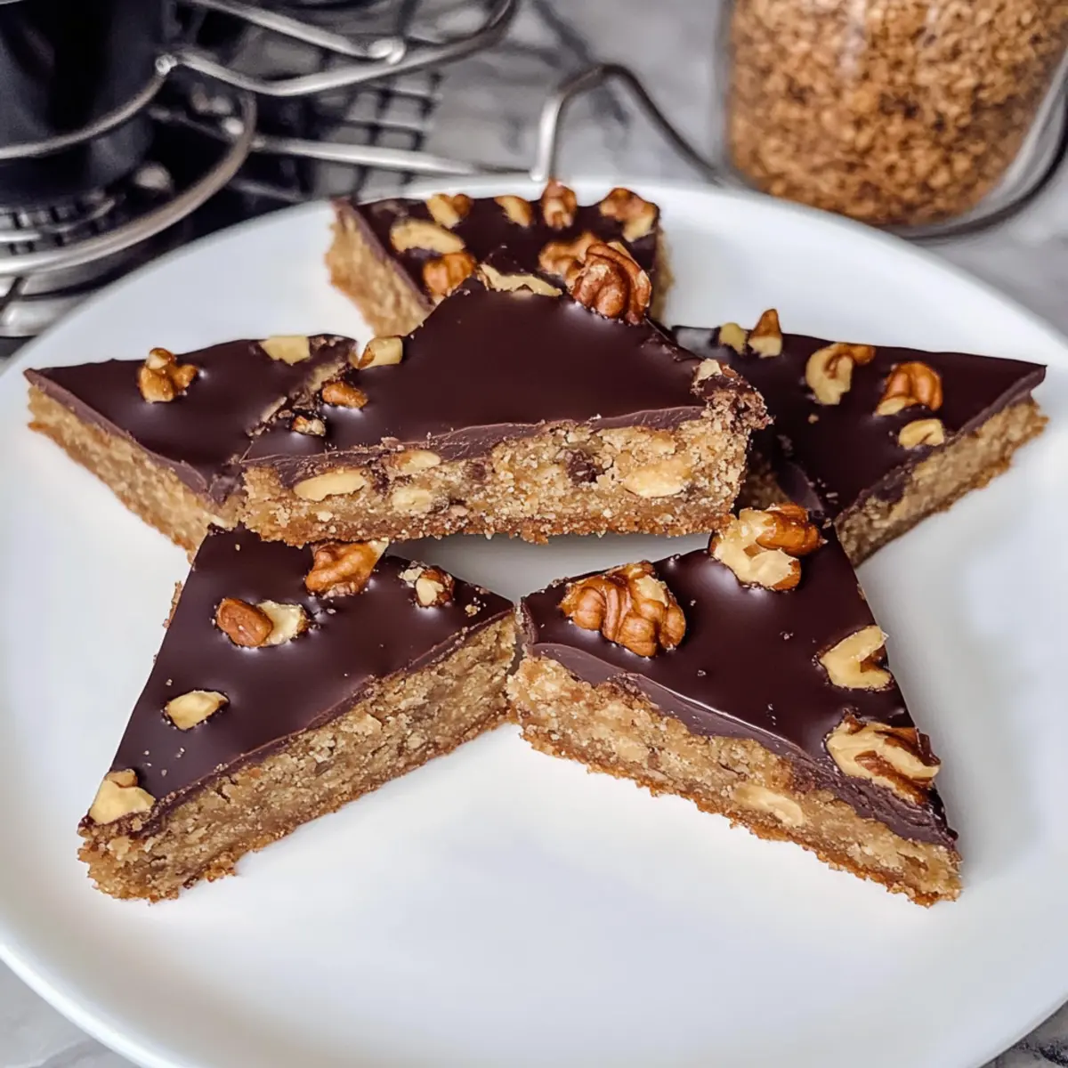 - Schmelze die dunkle Schokolade in einem kleinen Topf oder in der Mikrowelle und tauche die Kanten der Nussecken darin.