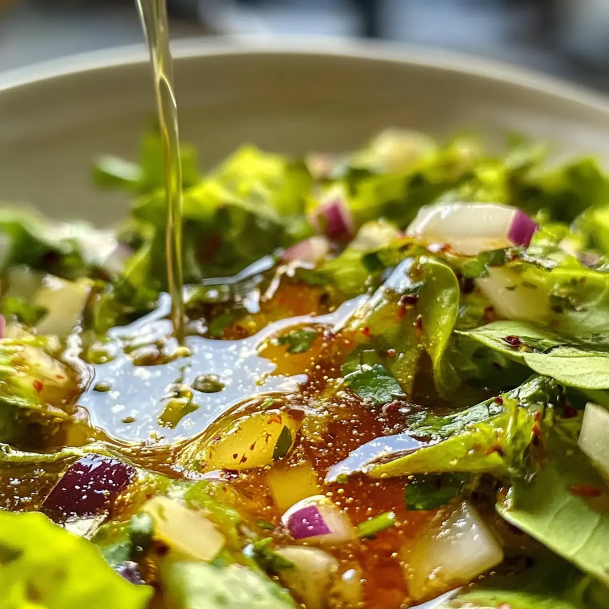 - Nussiges Aroma: Gib einen Esslöffel Sesamöl hinzu, um dem Dressing eine nussige Tiefe zu verleihen.